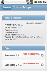 Esta aplicación móvil para sistema operativo ANDROID permite que los dueños de concesiones mineras conozcan el estado actual que guarda el pago de derechos, de conformidad con la fracción II del árticulo 27 de la Ley Minera, asi como los accesorios fiscales que le corresponden al momento de la consulta.